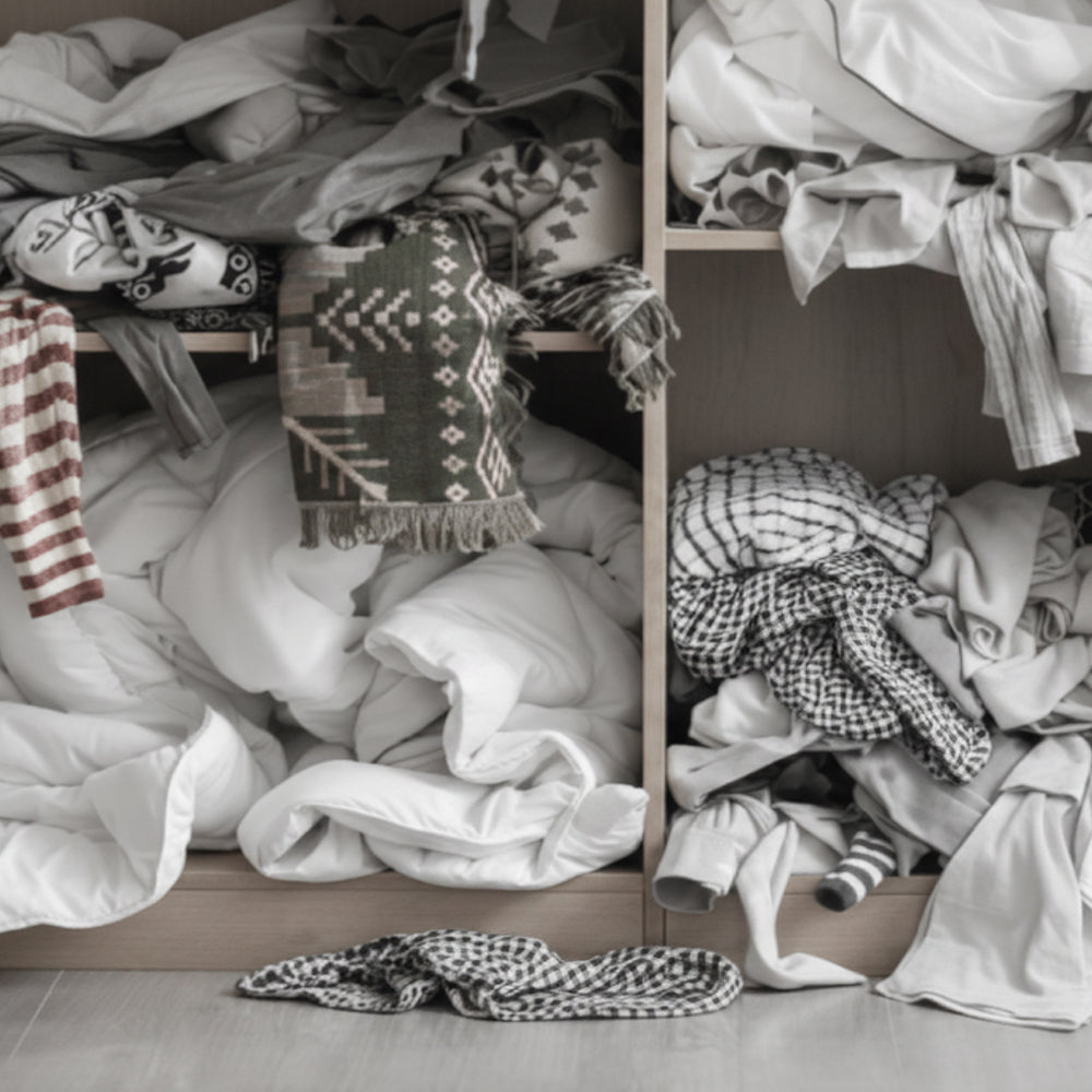 Piles of clothes, blankets, and bedding make rooms feel crowded, messy, and hard to manage.